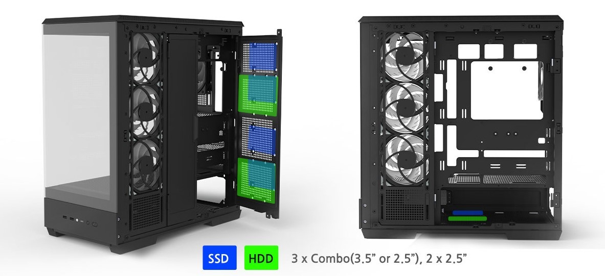 Вентиляція реалізована по всій площі корпуса: підтримується встановлення вентиляторів, включно з трьома у верхній частині, трьома з боку, одним позаду та трьома знизу.