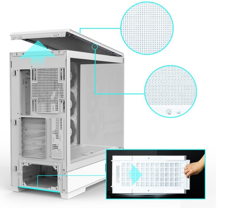 Верхня та нижня частини корпуса оснащені знімними пиловими фільтрами, що ефективно запобігають накопиченню пилу усередині системи. Це продовжує термін служби компонентів і спрощує регулярне обслуговування ПК.