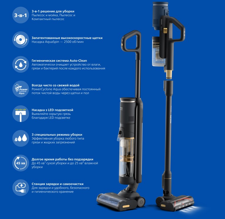 Идеально чистый пол одним движением.Встречайте Philips AquaTrio XW7264/11 - мощный беспроводной пылесос, который моет, пылесосит и высушивает пол одновременно. Благодаря инновационной системе двойных щеток и технологии разделения чистой и грязной воды он обеспечивает безупречный результат без труда. Забудьте о многоэтапной уборке - одна компактная система создана, чтобы возвращать блеск вашим полам каждый день.