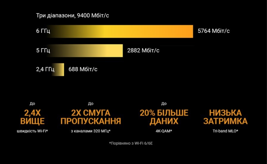 - Игровой маршрутизатор Wi-Fi 7 – новые каналы 320 МГц в диапазоне 6 ГГц и модуляция 4096-QAM значительно увеличивают пропускную способность, обеспечивая скорость передачи данных до 9400 Мбит/с.