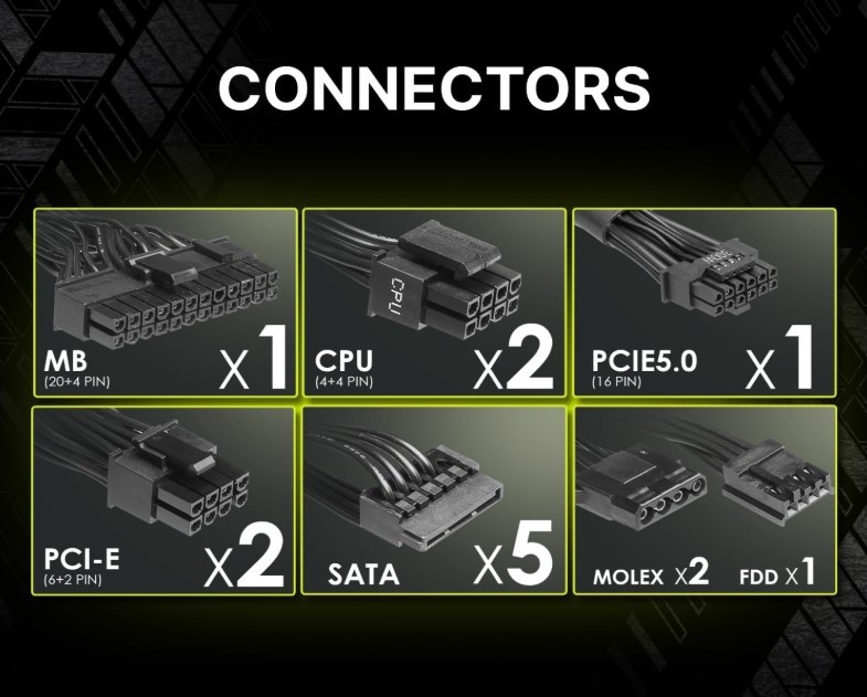 Блок питания оснащен специальным разъемом, поддерживающим стандарт PCIe 5.0. Это позволяет подключать видеокарты нового поколения, в том числе серии RTX 4070* и другие современные модели, обеспечивая им стабильное питание и надежную работу.
