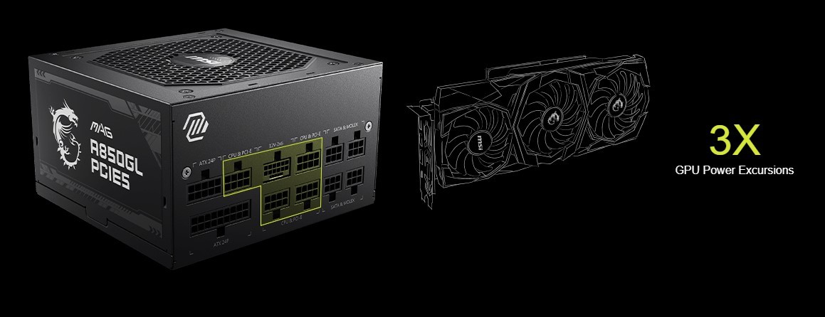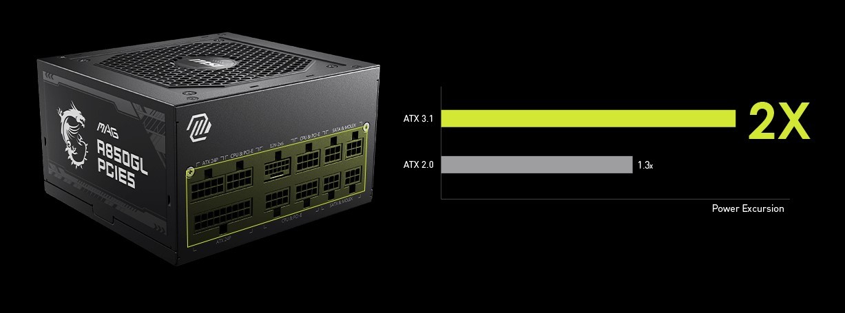 Блок питания имеет разъем, совместимый с PCIe 5.0 и Intel PSDG (Руководство по разработке блоков питания) ATX 3.0. Этот блок питания может выдержать до 2-кратного кратковременного увеличения общей мощности и 3-кратного кратковременного увеличения мощности видеокарты.