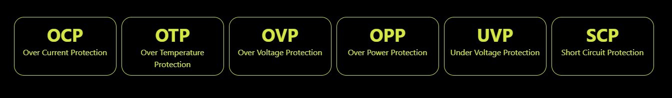 Чтобы гарантировать, что вся система может работать безопасно и стабильно в любое время, источник питания поставляется с рядом защитных механизмов.