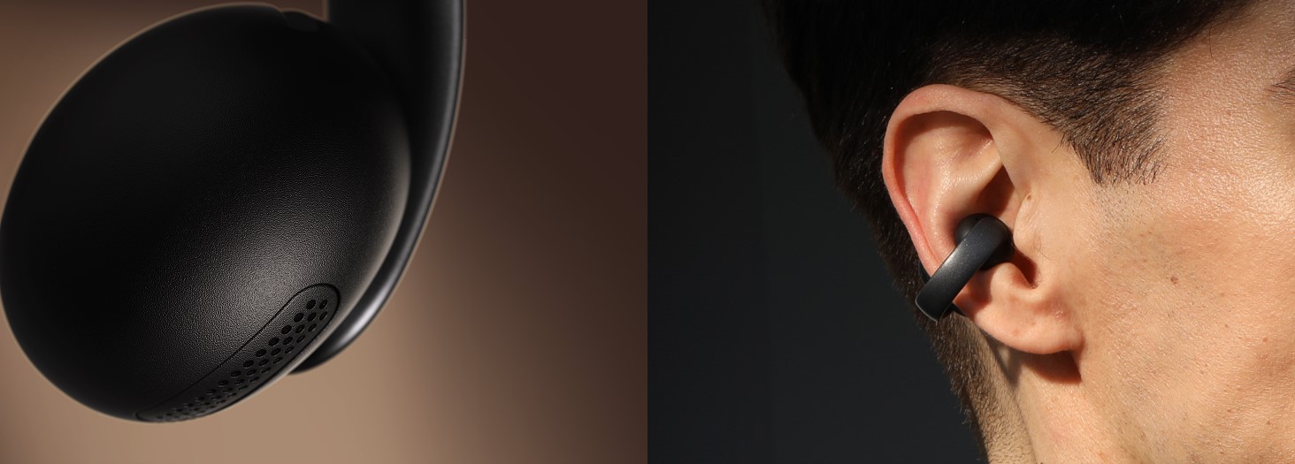 Основой наушников является гибкое открытое кольцо из титановой проволоки с эффектом памяти и эластичного TPU. Конструкция адаптируется к форме уха, равномерно распределяет давление и остается удобной даже при длительном ношении.
