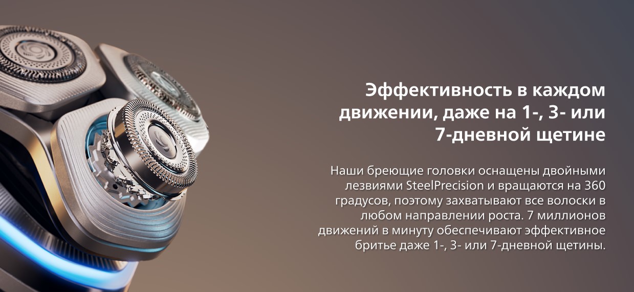 Полностью гибкие и компактные бреющие головки Precision Flexing 360° со специальными рельефами для бережного натяжения кожи динамично адаптируются к изгибам вашего лица. Головки обеспечивают постоянный контакт с кожей с точностью на 20% выше, чтобы захватить волоски на сложных участках шеи и под носом.