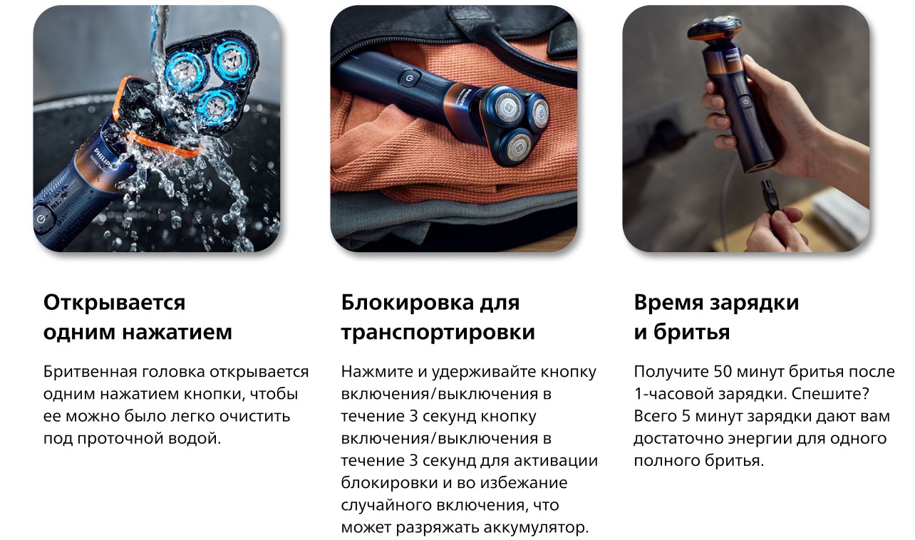 Какой бы способ бритья вы ни выбрали, бритва соответствует вашим потребностям. Наслаждайтесь удобным сухим или освежающим влажным бритьем.