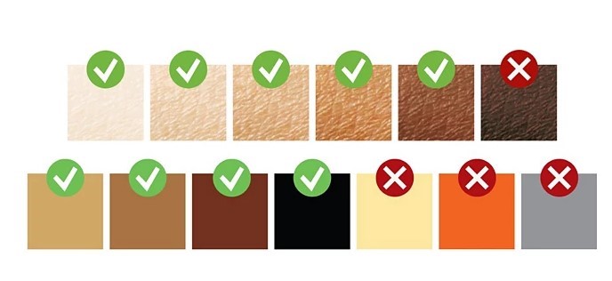 Фотоэпилятор эффективно работает с натуральными волосами тёмных оттенков — от тёмно-русого до чёрного — и подходит для кожи I–V фототипов (от светлой до тёмно-коричневой).