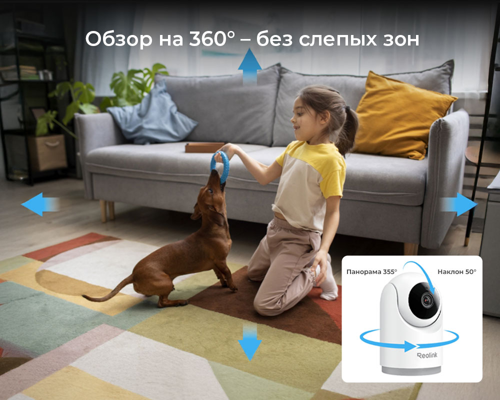 Наблюдайте за своими близкими и питомцами в режиме реального времени! Камера с разрешением 3MP Super HD и функцией обнаружения людей/животных. Полный обзор благодаря повороту 355° и наклону 50°.