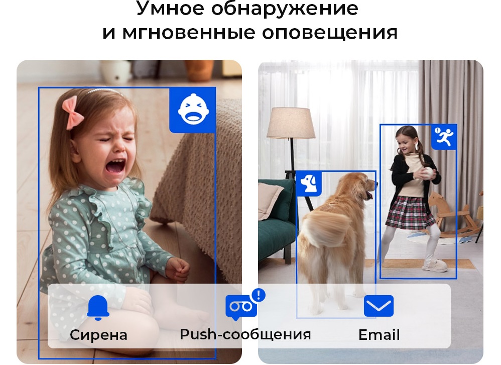 Камера не просто видит движение — она распознает людей, домашних животных и даже плач ребенка! Получайте мгновенные уведомления (Push-сообщения, Email, Сирена) только о действительно важных событиях.