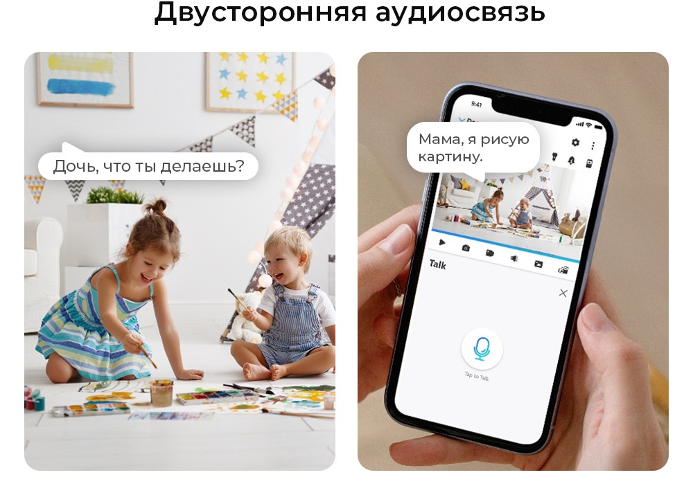 Встроенные микрофон и динамик позволяют вам общаться в реальном времени с близкими. Успокойте ребенка, поговорите с питомцем или дайте указания няне, находясь далеко от дома.