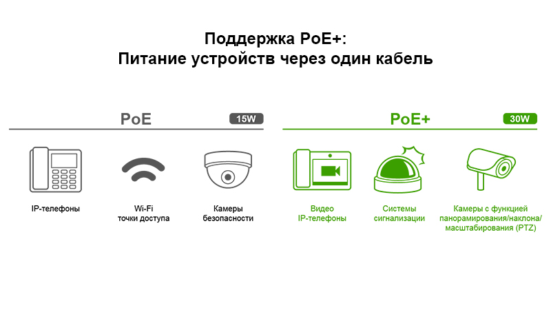Модель GS1100-10HP поддерживает стандарт PoE+ (IEEE 802.3at), который обеспечивает до 30 Вт мощности на порт. Это позволяет автоматически питать совместимые IP-телефоны, камеры видеонаблюдения или беспроводные точки доступа без необходимости в отдельных блоках питания.