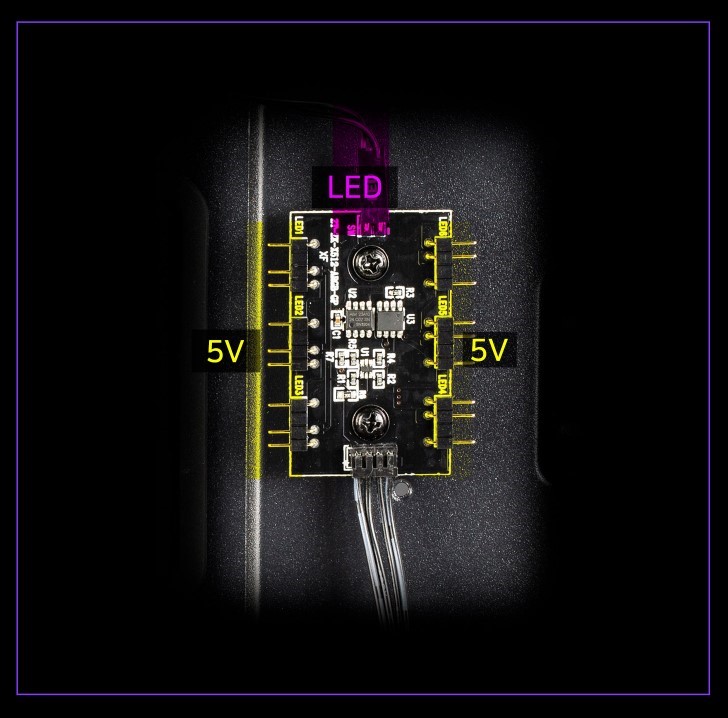 ARGB-контроллер позволяет легко управлять световыми эффектами с помощью специальной кнопки на верхней панели. Пользователь может выбирать из 26 различных шаблонов подсветки, синхронизировать их с материнской платой или полностью выключать, подстраивая систему под свой стиль.