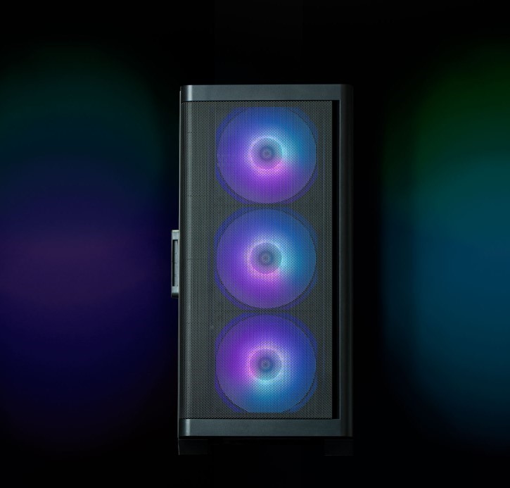 Корпус оснащен четырьмя предустановленными ARGB-вентиляторами: три спереди и один сзади. Они обеспечивают интенсивное движение воздуха, быстрое рассеяние тепла и одновременно создают стильный визуальный эффект благодаря подсветке.