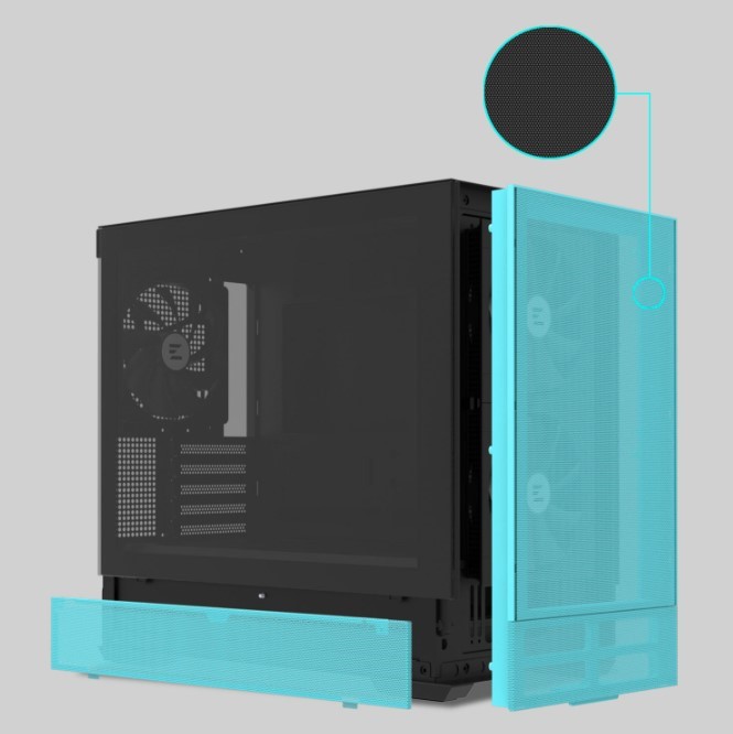 Zalman P30 Air получил высокопроизводительные панели, обеспечивающие оптимальный воздухообмен. Передняя, верхняя и боковая панели имеют сетчатую структуру, позволяющую воздуху свободно циркулировать, поддерживая стабильную температуру даже при интенсивной нагрузке системы.