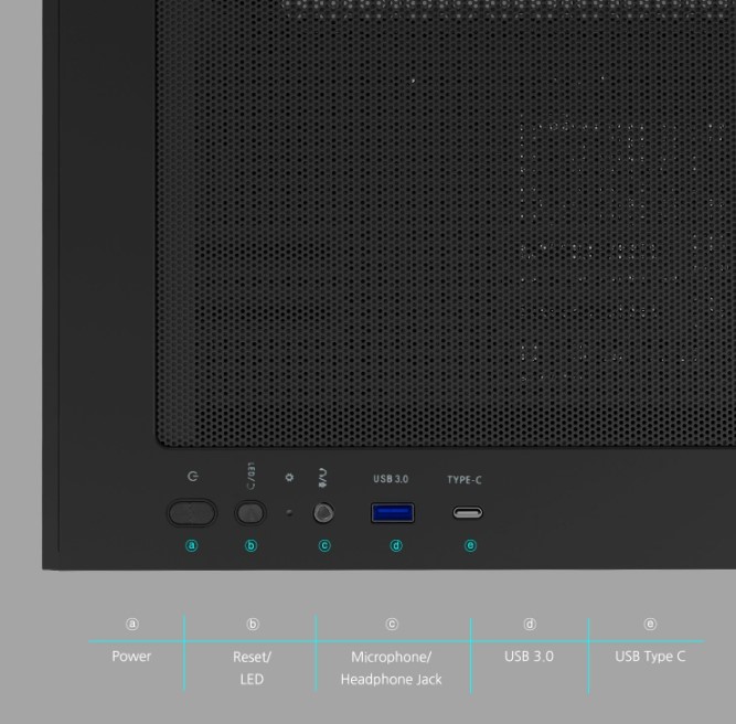 Верхняя панель обеспечивает быстрый доступ к основным портам. Здесь расположены кнопки питания, сброс и индикатор LED, комбинированный аудиоразъем для наушников и микрофона, порт USB 3.0 и современный разъем USB Type-C. Такая организация делает подключение устройств удобным вне зависимости от расположения корпуса.
