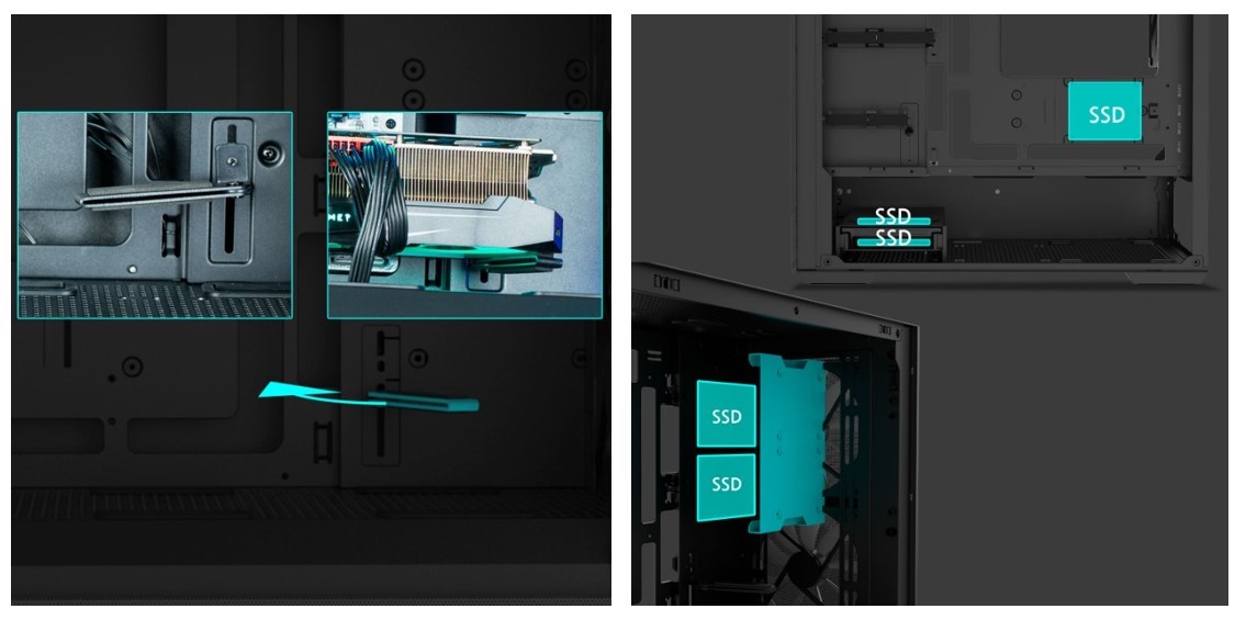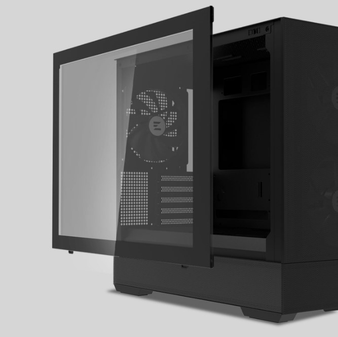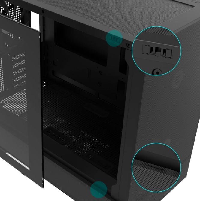 Благодаря системе крепления без инструментов стекло можно легко снять для доступа к комплектующим – достаточно легкого нажатия. Специальные пазы снизу обеспечивают дополнительную безопасность при снятии панели, уменьшая риск повреждения.
