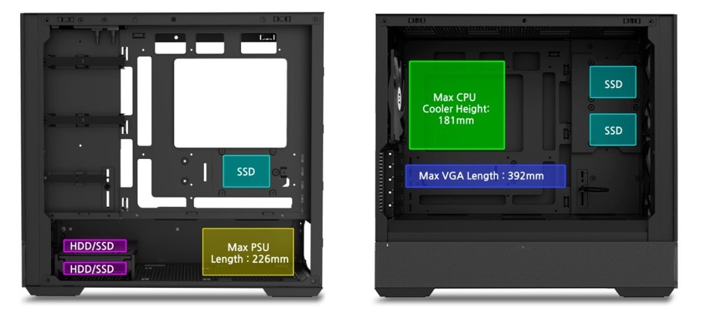 Корпус поддерживает процессорные кулеры высотой до 181 мм, видеокарты длиной до 392 мм и блоки питания до 226 мм.