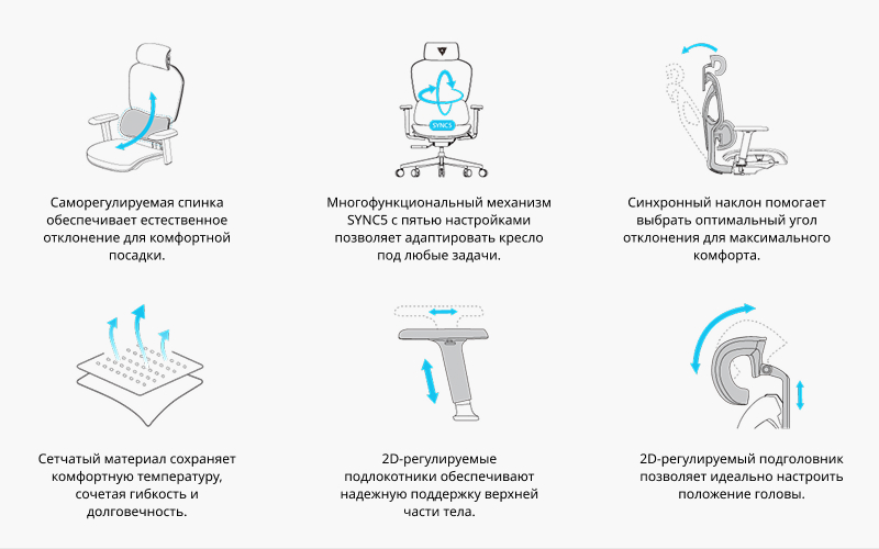 Настройте кресло под себя — в зависимости от роста, осанки и личных предпочтений. Благодаря механизму SYNC5 кресло легко подстраивается под особенности вашего тела в пяти направлениях. Синхронный механизм наклона позволяет спинке и сиденью двигаться одновременно, повторяя естественные изгибы тела и обеспечивая правильную посадку на протяжении всего рабочего дня.