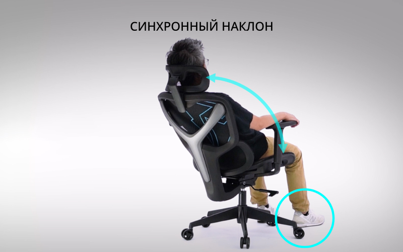 Просто отклонитесь назад, и спинка вместе с сиденьем плавно наклонятся одновременно. Это поддерживает естественный изгиб позвоночника под разными углами, создавая более комфортное сидение.