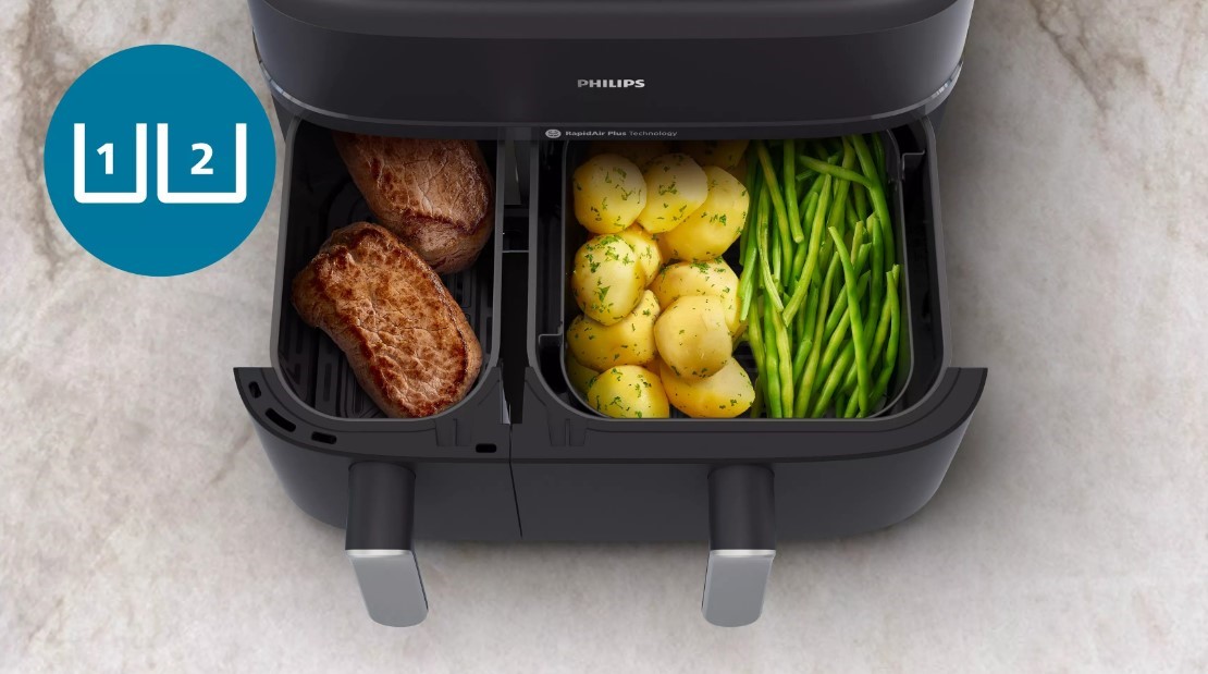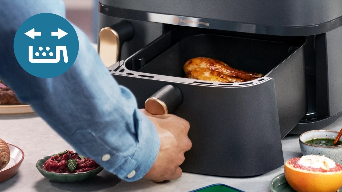 Объем 9 литров разделен на две корзины разного размера: большую - 6 л, для основных блюд и большой порции картофеля фри, и маленькую - 3 л, для гарниров или закусок. Мультипечь легко содержит целую курицу, большой объем овощей или любимые блюда для семьи.