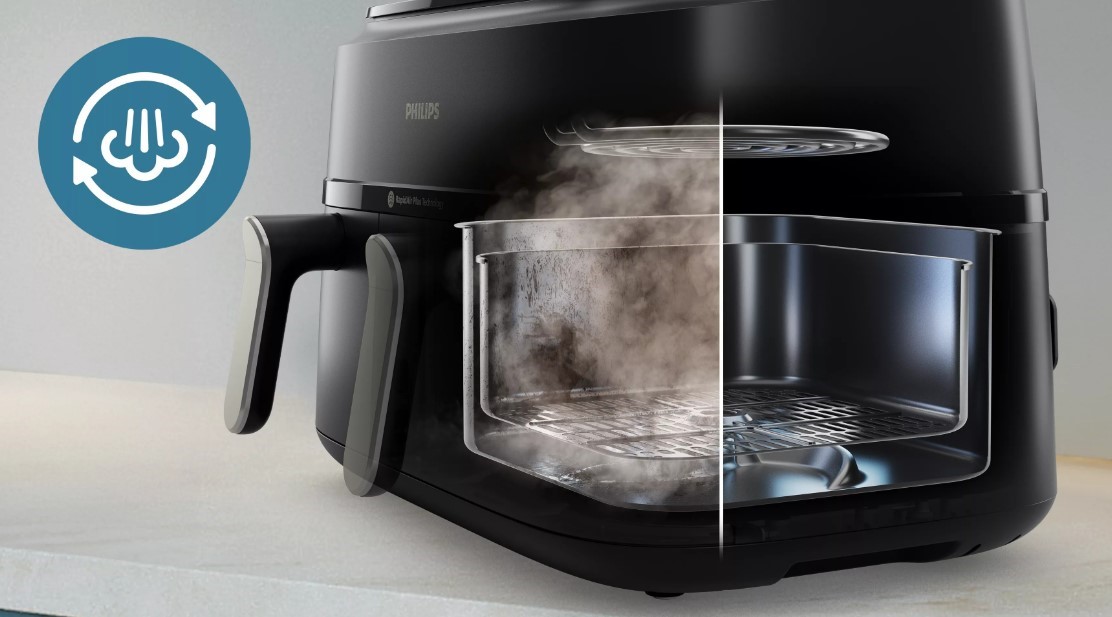 Автоматическая паровая очистка эффективно удаляет жир из корзины и нагревательных элементов. Теперь устройство легко поддерживать в чистоте после каждого использования.