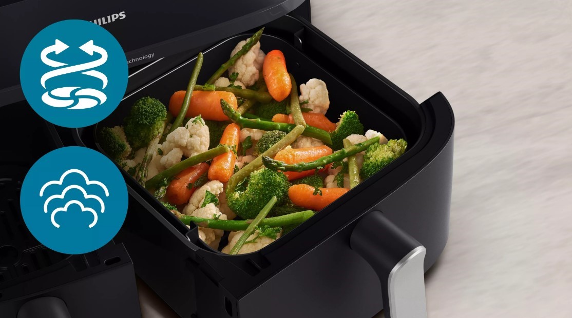 Инновационная технология RapidAir Plus с фирменной звездообразной конструкцией обеспечивает активную циркуляцию горячего воздуха, что позволяет прогреваться одинаково со всех сторон. В результате блюда получаются сочными, ароматными и идеально приготовленными внутри и снаружи, без пересушивания и сырых участков.