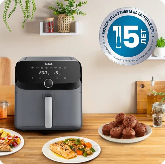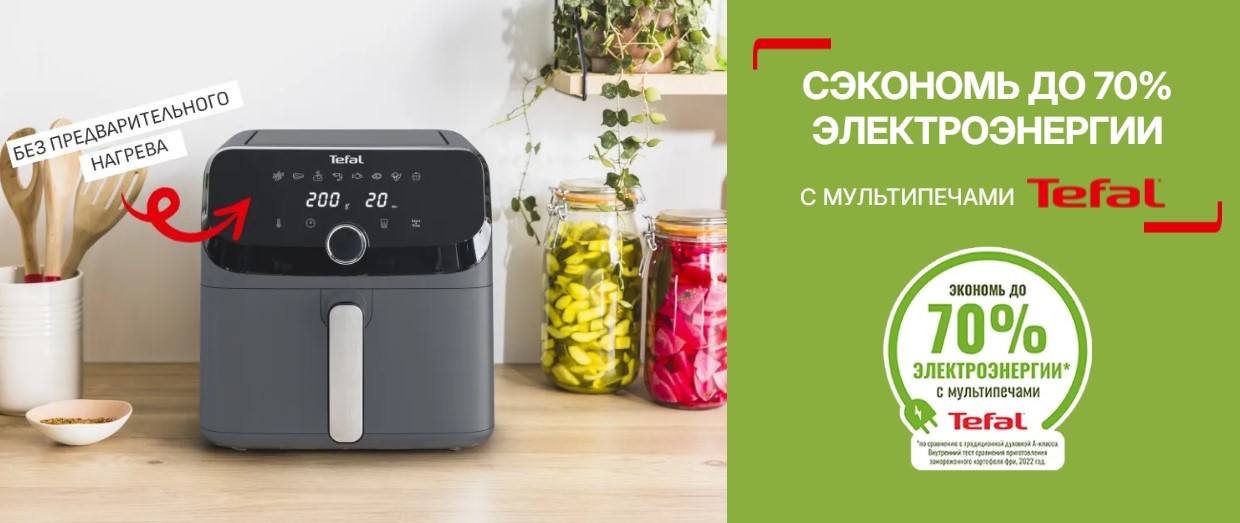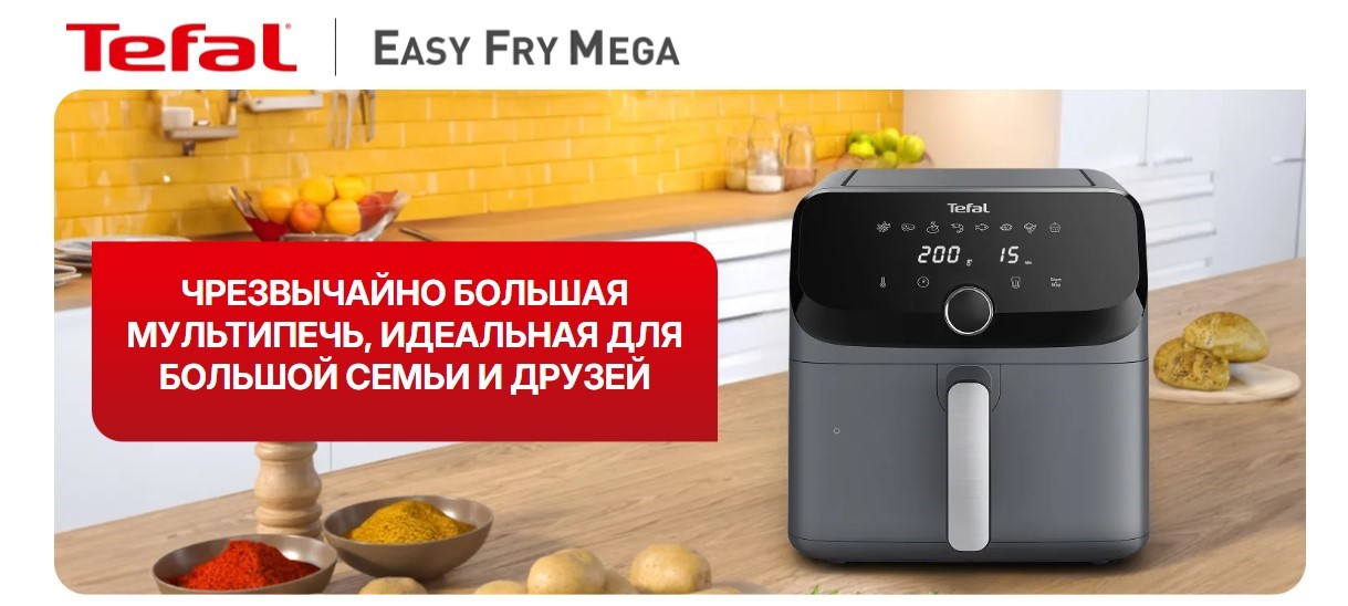 Мультипечь Tefal Easy Fry Mega объемом 7,5 литра позволяет одновременно приготовить до 8 порций любимых блюд.