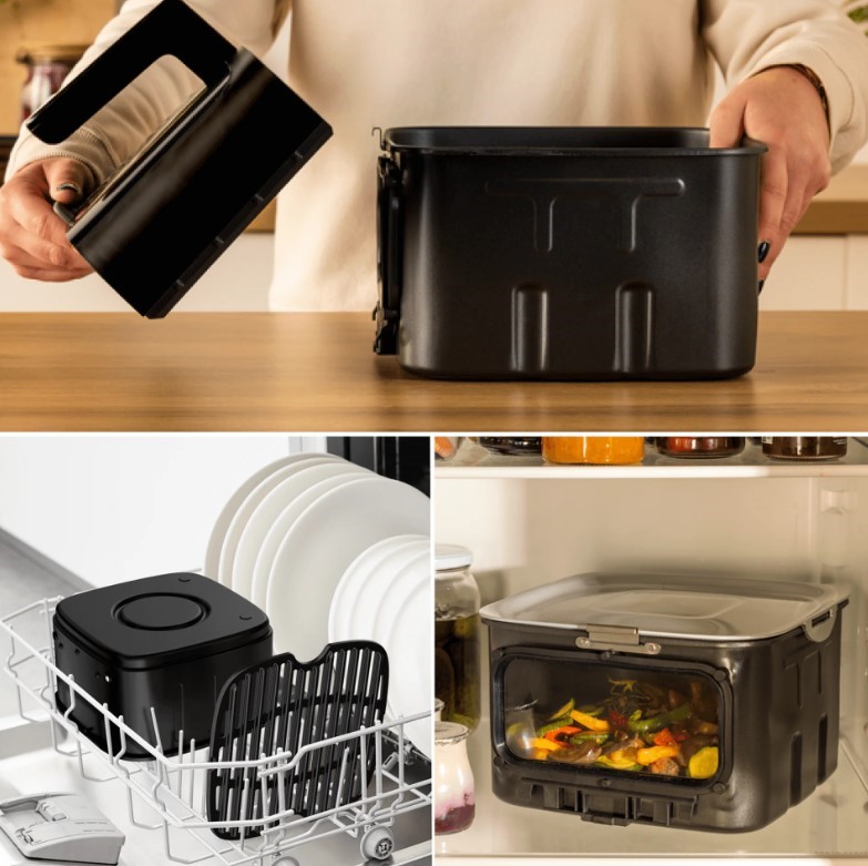 Съёмная панель с удобной ручкой позволяет легко извлекать чашу со блюдами и переносить её прямо в холодильник или на стол. Чаша полностью совместима с посудомоечной машиной, что упрощает мытьё. Дополнительная крышка обеспечивает удобное хранение и защищает чашу от загрязнений.