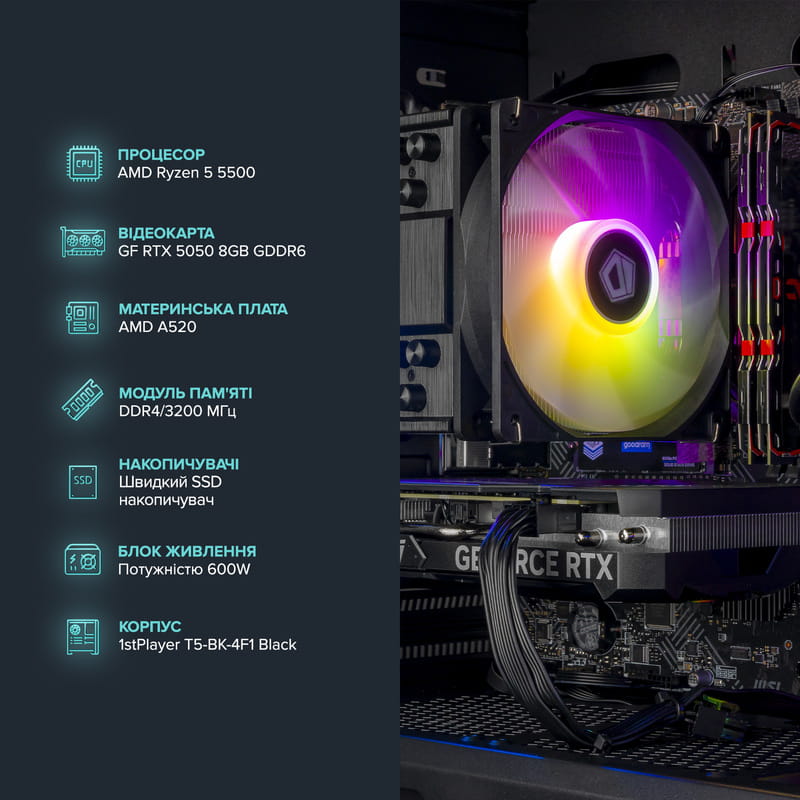 Добрий день. На сьогодні встановлюють наступні комплектуючі: Відеокарта GF RTX 5050 8GB GDDR6 Dual OC Asus (DUAL-RTX5050-O8G) Блок живлення 1stPlayer PS-700FK (FK-700-BK-EU) 700W Корпус 1stPlayer T5-BK-4F1 Black без БЖ Материнська плата Asus TUF Gaming A520M-Plus WiFi Socket AM4 Модуль пам’яті DDR4 2x8GB/3200 G.Skill Aegis (F4-3200C16D-16GIS) Накопичувач SSD 1TB Goodram PX600 M.2 2280 PCIe 4.0 x4 NVMe 3D NAND (SSDPR-PX600-1K0-80) Процесор AMD Ryzen 5 5500 (3.6GHz 16MB 65W AM4) Box (100-100000457BOX) Кулер процесорний ID-Cooling SE-214-XT ARGB