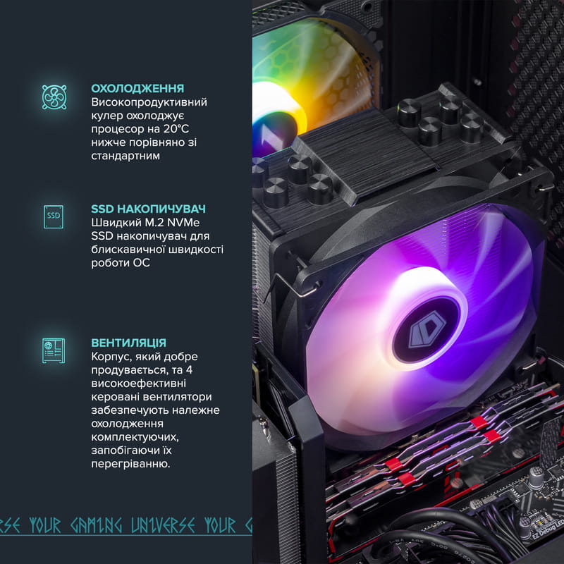 Высокопроизводительный кулер снижает температуру процессора на 20°C по сравнению со стандартными решениями, что обеспечивает стабильную работу даже при самых высоких нагрузках. Быстрый М.2 NVMe SSD накопитель гарантирует молниеносную скорость работы операционной системы и приложений, что значительно сокращает время загрузки и повышает общую производительность системы. Благодаря хорошо продуваемому корпусу и четырем высокоэффективным управляемым вентиляторам, все компоненты остаются охлажденными, предотвращая перегрев и обеспечивая долговременную стабильную работу ПК даже во время самых интенсивных игровых сессий или ресурсоемких задач.