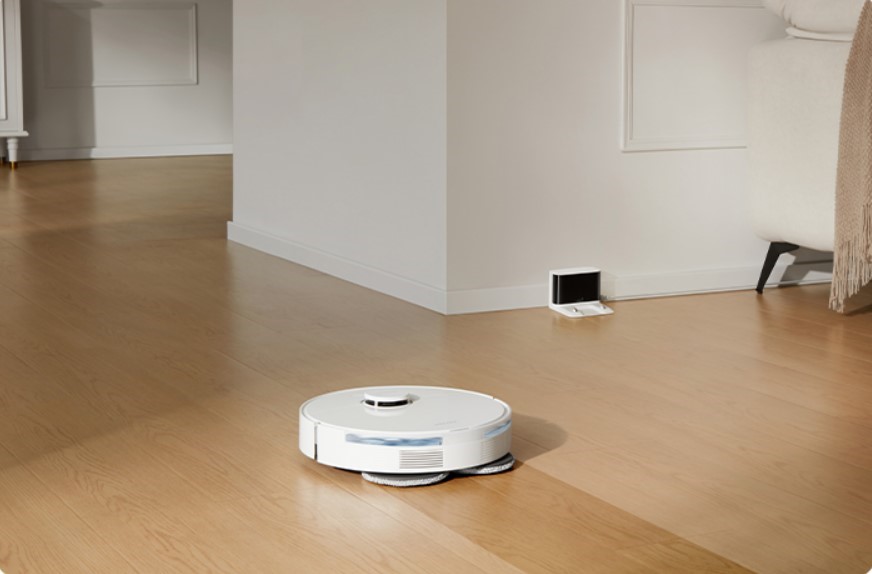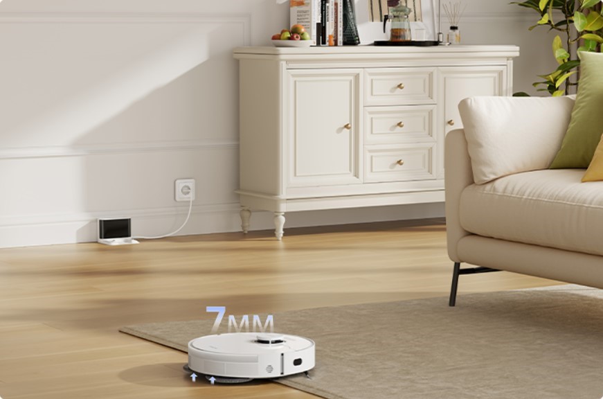 Dreame L40 выполнен в сдержанном минималистическом стиле с матовым покрытием. Он выглядит аккуратно и современно независимо от стиля интерьера. Низкий профиль корпуса помогает проходить под диванами и шкафами, а белая цветовая гамма и текстуры делают его частью современной техники.