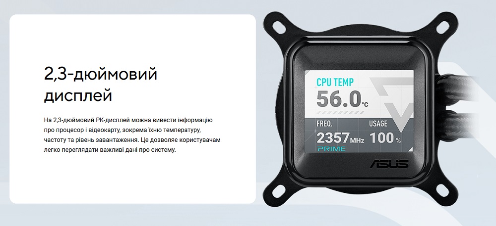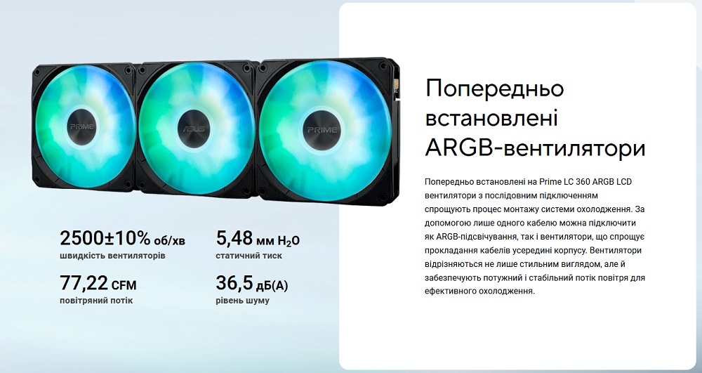 Prime LC 360 ARGB LCD поєднує в собі такі важливі переваги, як ефективність охолодження, 2,3-дюймовий РК-дисплей і простота монтажу. Помпа Asetek зі збалансованими характеристиками допоможе процесору розкрити свій потенціал, а РК-дисплей дасть змогу легко контролювати роботу процесора та відеокарти. Крім того, попередньо встановлені ARGB-вентилятори з послідовним підключенням підвищують зручність складання комп’ютера та полегшують прокладання кабелів.