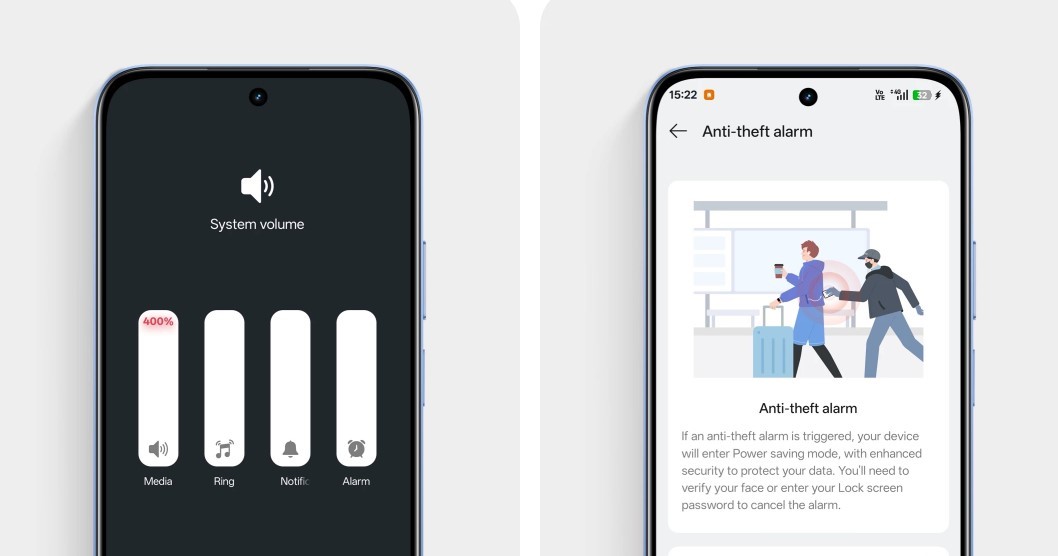 NFC обеспечивает быстрые бесконтактные платежи и подключение. Повышенная до 400% громкость позволяет чётко слышать звонки и уведомления даже в шумной среде. Realme C85 поддерживает дистанционную блокировку и функцию звукового сигнала тревоги. Это помогает защитить личные данные и быстро реагировать в случае потери устройства.