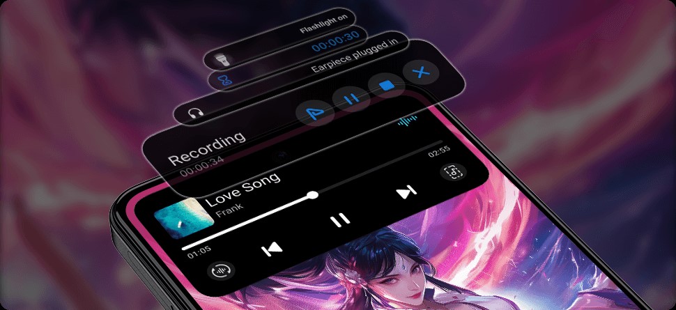 Интерактивный островок 2.0 на дисплее обеспечивает быстрый доступ к уведомлениям, напоминаниям и текущим действиям в реальном времени. Сканер отпечатков пальцев, интегрированный в дисплей, обеспечивает быстрый доступ к устройству.