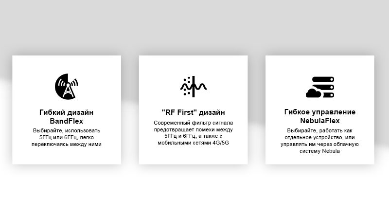 "RF First" дизайн: Современный фильтр сигнала предотвращает помехи между 5ГГц и 6ГГц, а также с мобильными сетями 4G/5G. Гибкое управление NebulaFlex: Выбирайте, работать как отдельное устройство, или управлять им через облачную систему Nebula.
