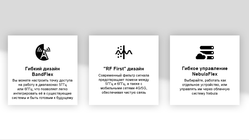 - Гибкое управление NebulaFlex: Выбирайте, работать как отдельное устройство, или управлять им через облачную систему Nebula.