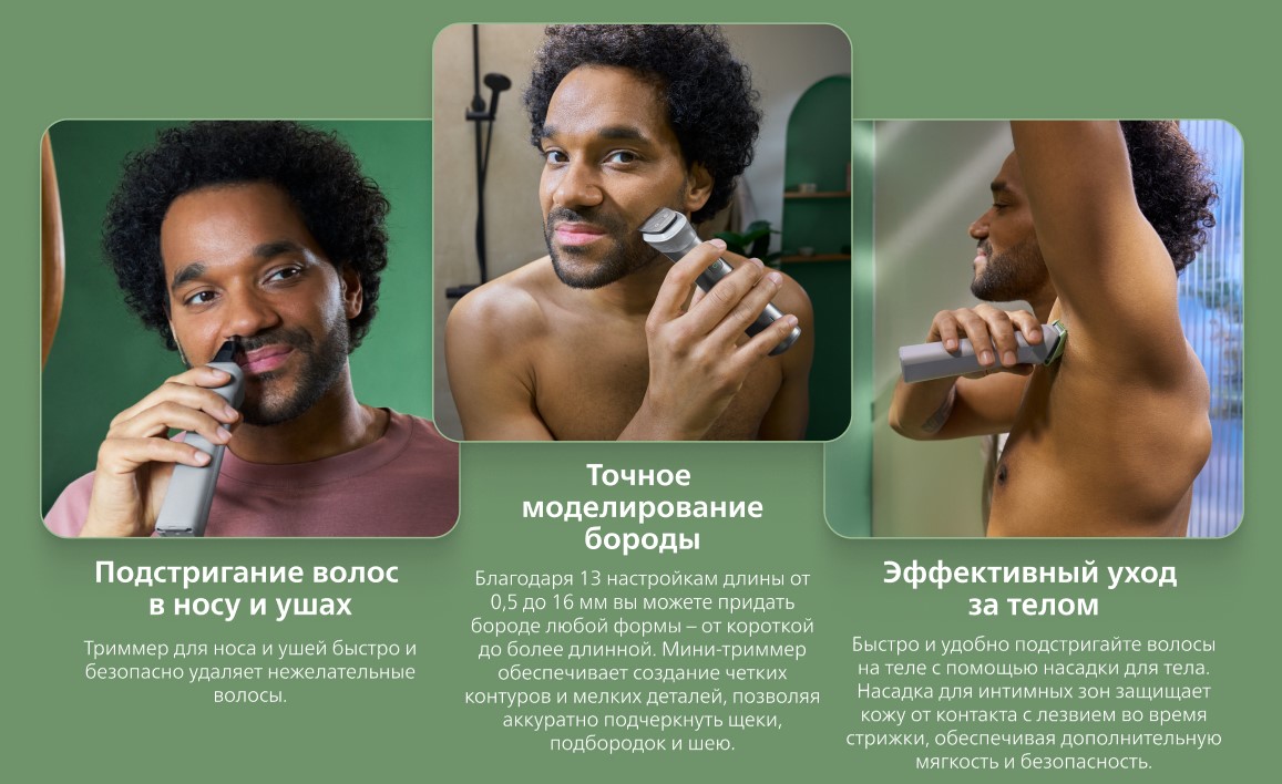 Наш триммер оснащен инструментами, позволяющими моделировать волосы на бороде, подстригать волосы на голове и ухаживать за телом, удовлетворяя все ваши потребности в уходе.