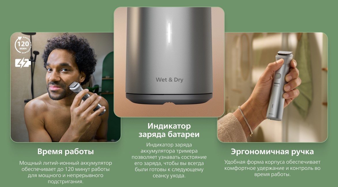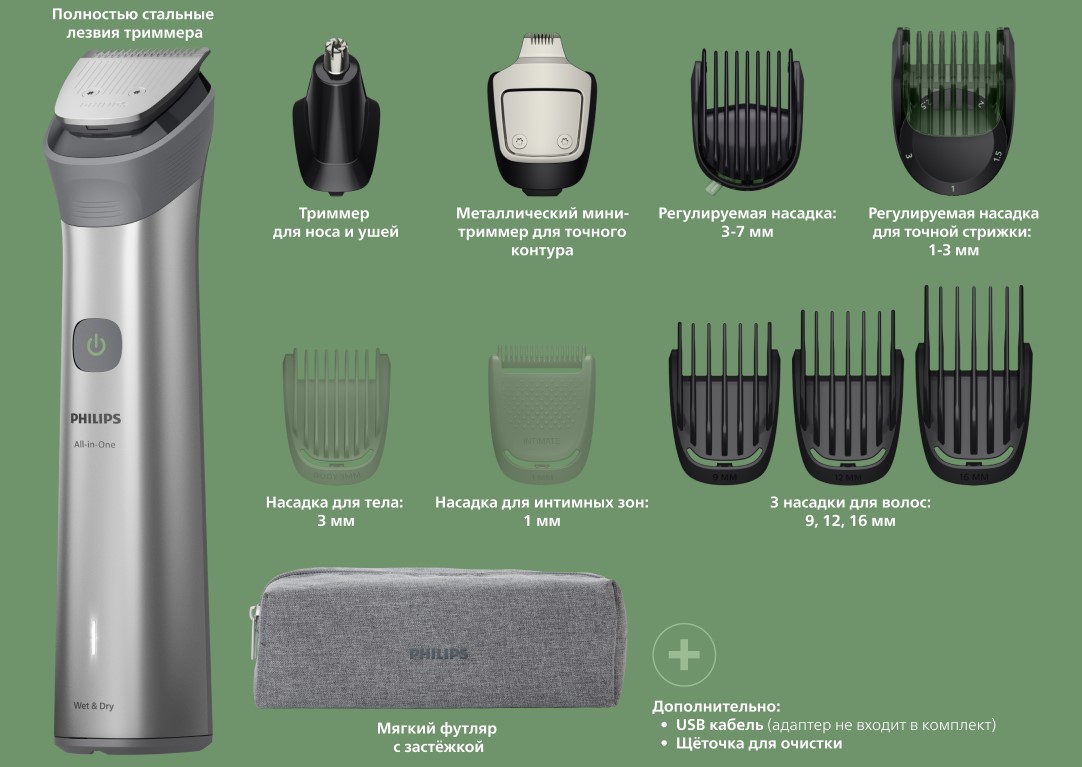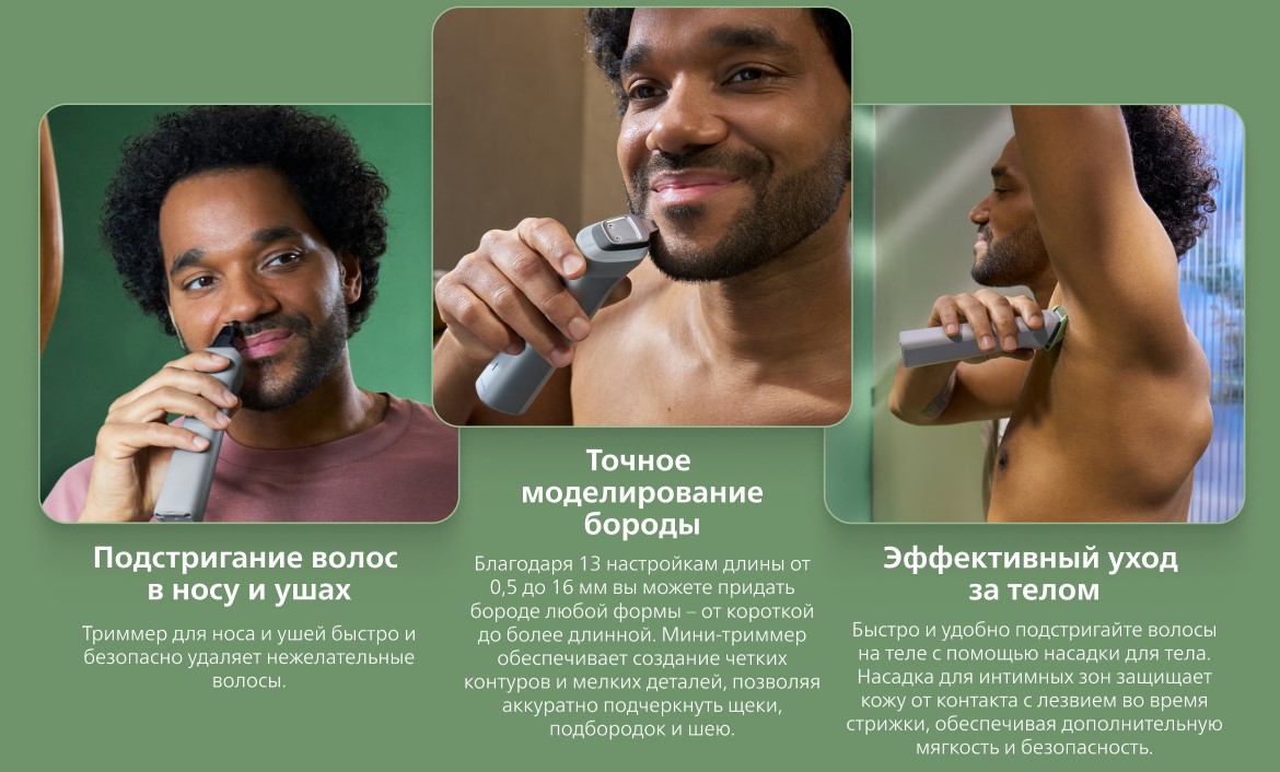 Наш триммер оснащен инструментами, позволяющими моделировать волосы на бороде, подстригать волосы на голове и ухаживать за телом, удовлетворяя все ваши потребности в уходе.