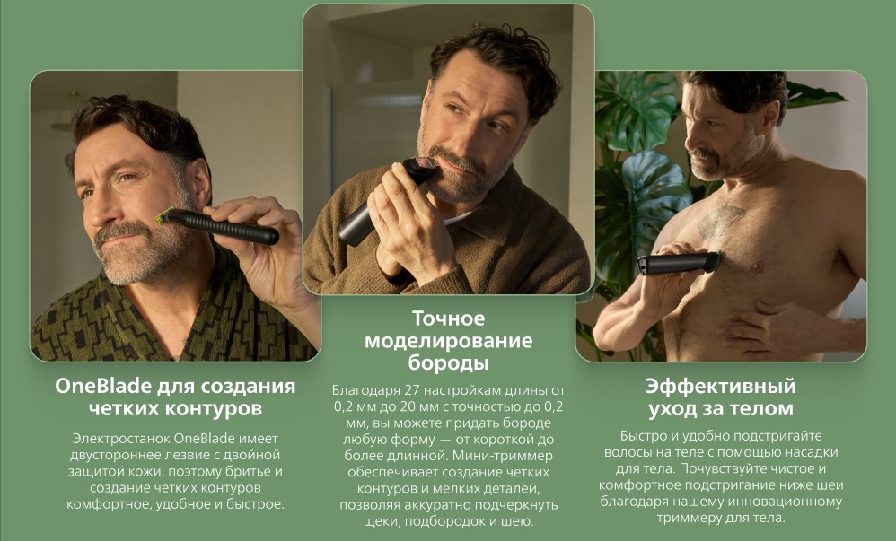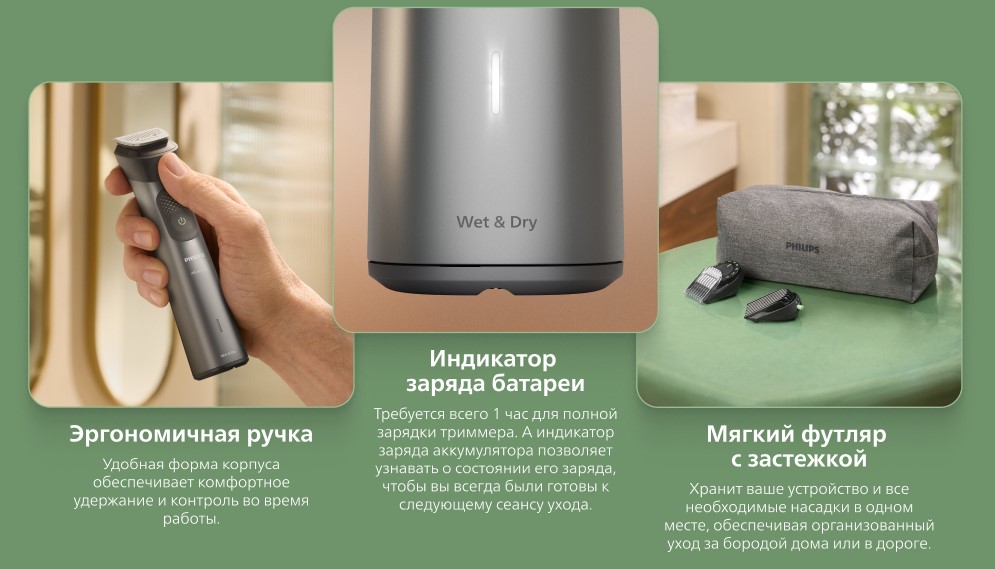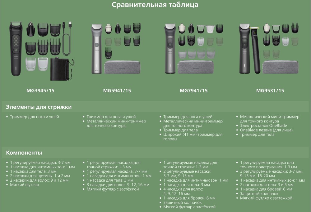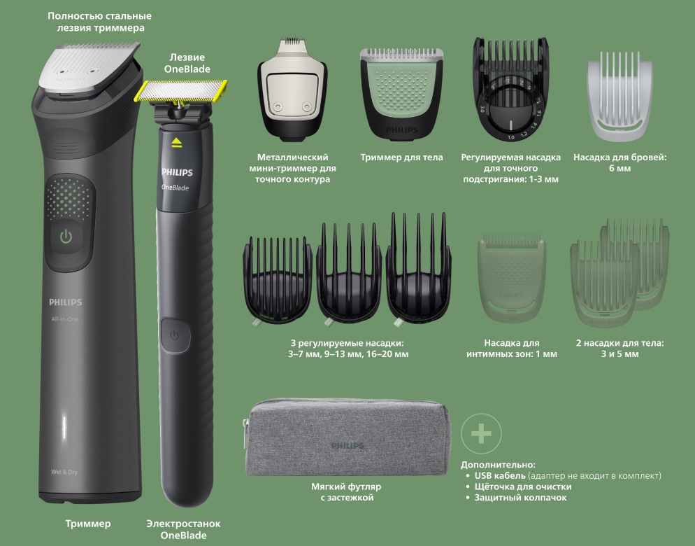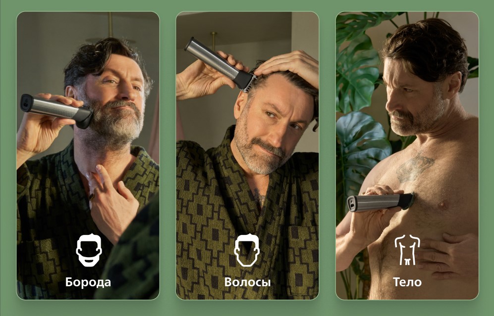 Наш триммер оснащен инструментами, которые позволяют брить и моделировать волосы на бороде, стричь волосы на голове и ухаживать за телом, удовлетворяя все ваши потребности в уходе.