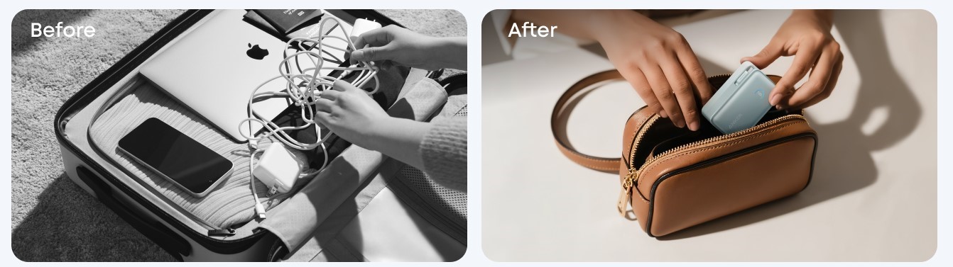 USB-C обеспечивает выходную мощность 45 Вт, а входной порт 30 Вт заряжает сам павербанк примерно за 2 часа. Например, iPhone 16 Pro заряжается до 50% всего за 27 минут.