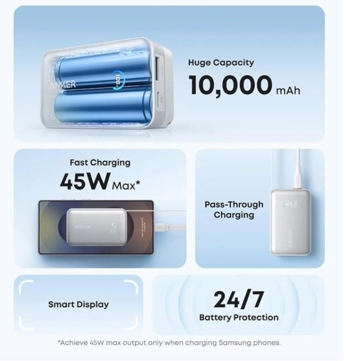 Павербанк поддерживает быструю зарядку до 45 Вт, технологию Pass-Through для одновременной зарядки самого устройства и гаджетов, а LCD-дисплей отображает уровень заряда и статус подключения. Порт USB-C совместим с Samsung Fast Charging 2.0 для максимальной скорости зарядки.