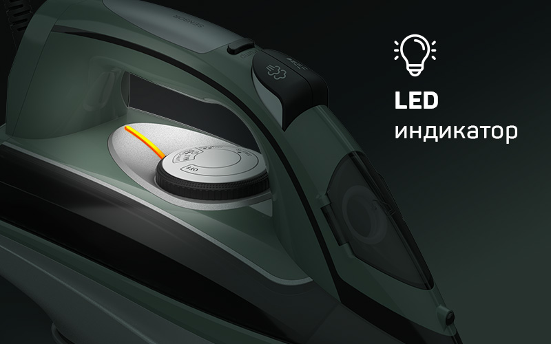Светодиодный индикатор показывает состояние утюга, информируя, когда он нагревается или готов к использованию. Эта функция обеспечивает более удобную и безопасную глажку, чётко показывая момент достижения оптимальной температуры.