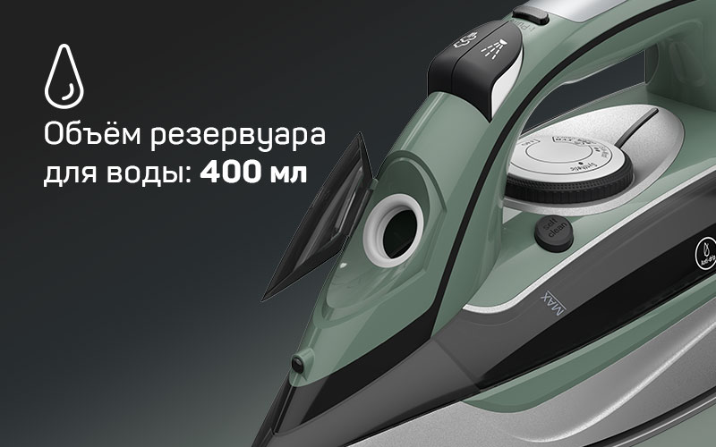 Увеличенный резервуар для воды объёмом 400 мл позволяет гладить дольше без необходимости частого долива воды. Такой объём также идеально подходит для генерации пара при глажке большого количества белья. Выбирайте больший резервуар — для удобства и экономии времени.