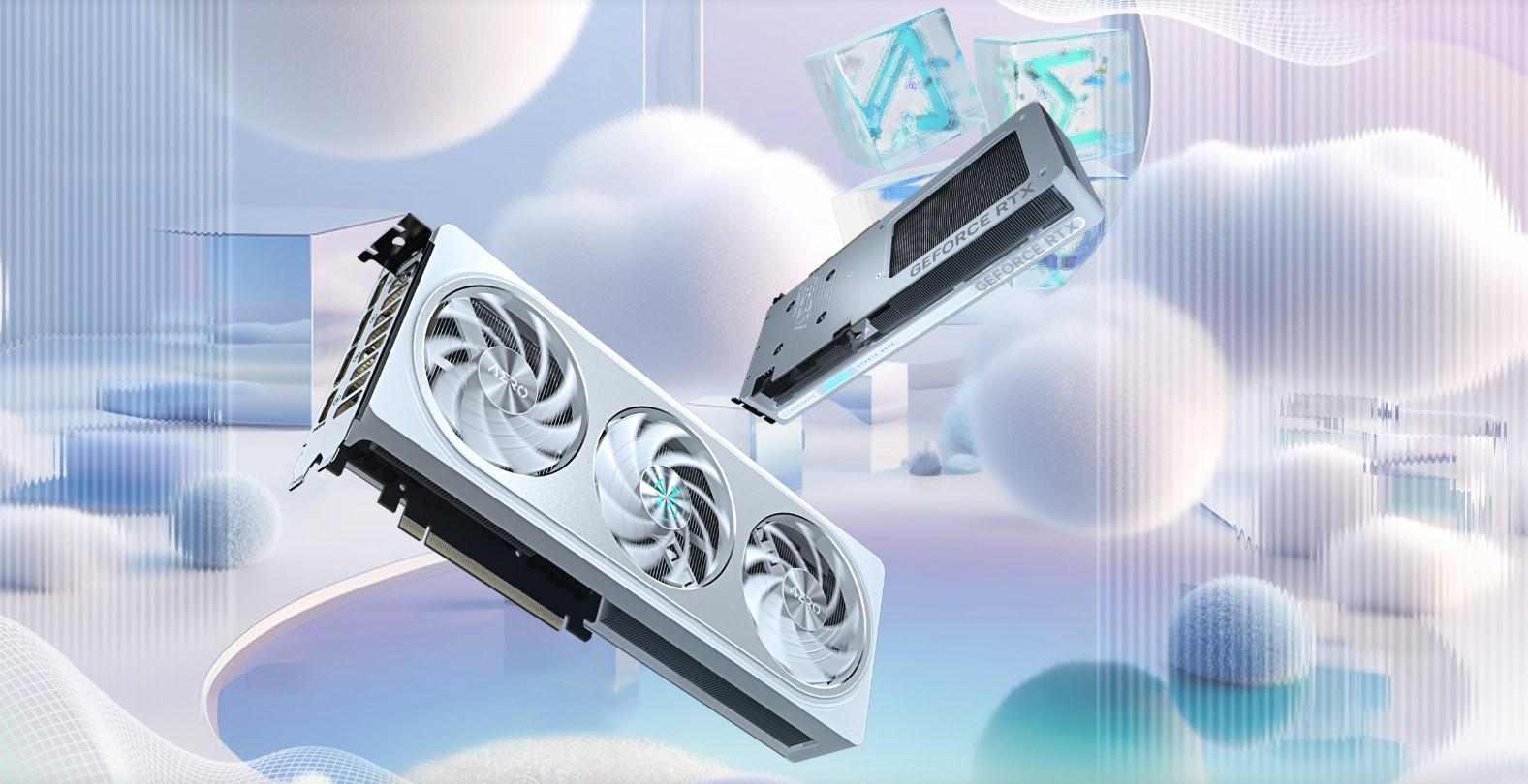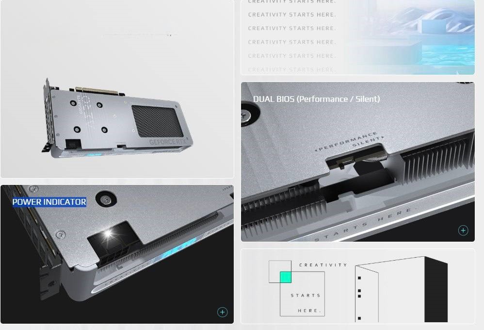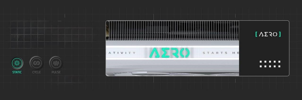 Вдохновленная водой: волны на задней панели напоминают поток воды, с зеркальными, матовыми и световыми элементами, отражающими мерцающую поверхность воды. Металлическая отделка улучшает текстуру, а бирюзовые и радужные оттенки подчеркивают спокойствие озера. Вращение вентилятора создаёт расширяющиеся волны, добавляя естественное движение деталям. С 16,7 млн цветов и множеством эффектов можно выбрать любой эффект или синхронизировать с другими устройствами через GIGABYTE CONTROL CENTER.