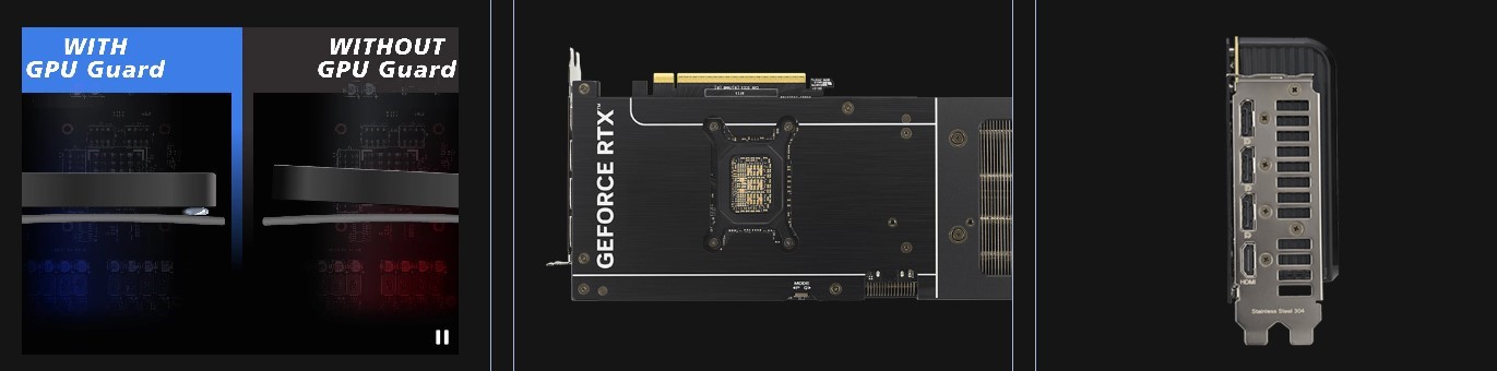- ASUS GPU Guard и кронштейн: Технология ASUS GPU Guard предусматривает нанесение клея на все четыре угла GPU, чтобы уменьшить риск появления трещин, а специальный кронштейн обеспечивает постоянное давление и стабильность.