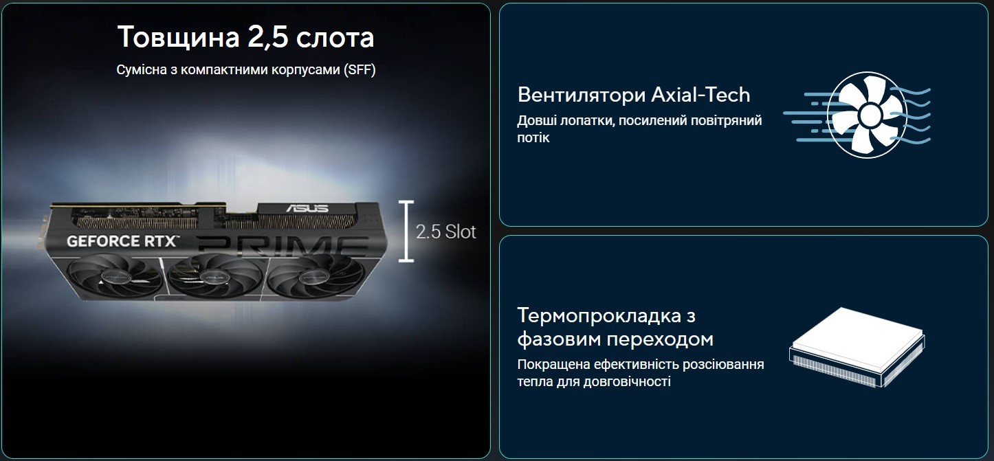 Видеокарта Prime GeForce RTX 5070 имеет 2,5-слотовую конструкцию с тщательно продуманным расположением кожуха, радиатора и тепловых трубок, что позволяет трём вентиляторам Axial-tech эффективно использовать вентиляцию боковых панелей корпуса и обеспечивать оптимальные температурные характеристики.
