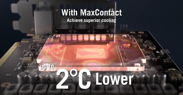 MaxContact – это уникальный технологический процесс в производстве видеокарт ASUS, который позволяет увеличить площадь контакта между теплораспределителем и графическим процессором на 5% по сравнению с традиционными решениями. Работая в сочетании с массивом радиаторов и мощными вентиляторами Axial-tech, эта технология позволяет снизить температуру на дополнительные 2°C.