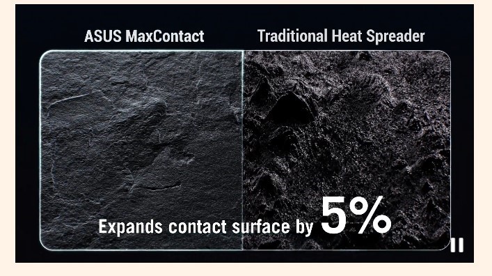 MaxContact — это специальный производственный процесс ASUS, который эффективно увеличивает площадь поверхности теплораспределителя, расположенного на графическом процессоре, на 5% по сравнению с традиционными конструкциями. Это улучшает температуру до 2°C в сочетании с массивным радиатором и мощными вентиляторами Axial-tech.