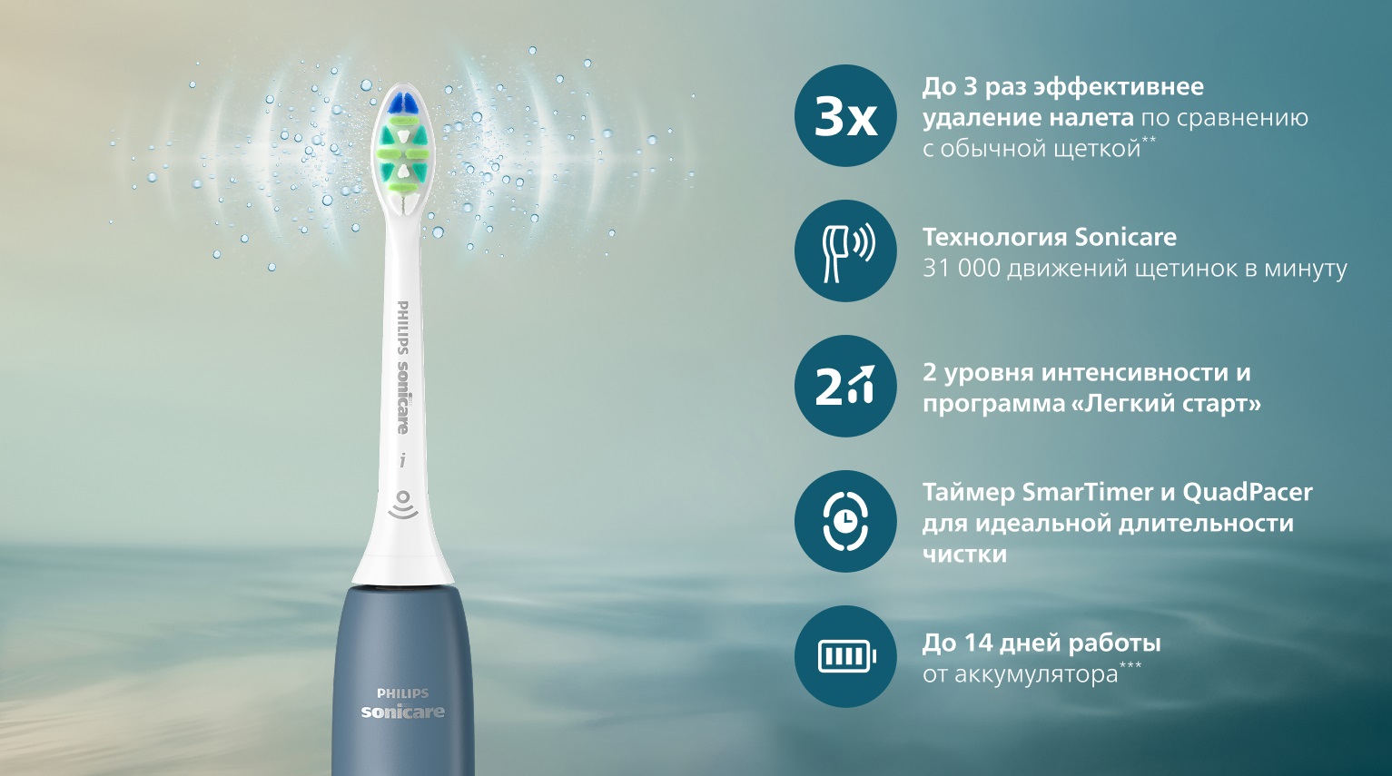 Зубные щетки Philips Sonicare деликатно, но эффективно очищают благодаря 31 000 движениям щетинок в минуту. Поток микропузырьков Sonicare Fluid Action проникает глубоко между зубами и вдоль линии десен для лучшего очищения и ухода.