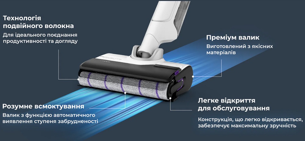 Щоб покращити ваш досвід прибирання використовуємо моторизований валик з мікрофібри, який використовуючи технологію подвійного волокна пропонує розумне всмоктування та легке обслуговування.